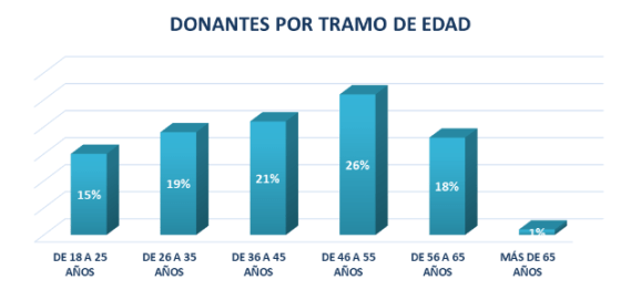 Este gráfico muestra que la mayoría de los donantes (26%) tiene entre 46 y 55 años, mientras que solo el 15% son jóvenes de 18 a 25 años.