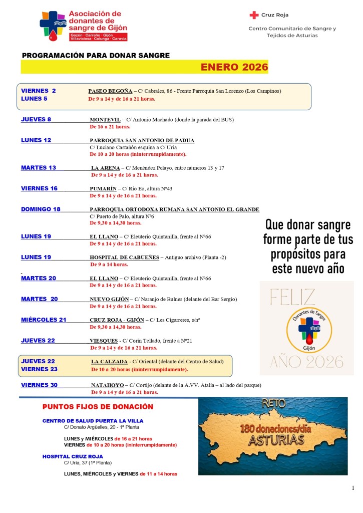 Puedes consultar los puntos de donación que se programan cada mes para la zona de influencia de la Asociación de Gijón pinchando en el mapa.